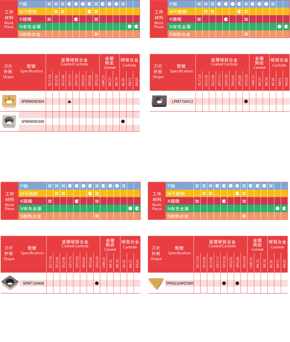 | Insert Grades - Milling 銑刀片牌號一覽表 |