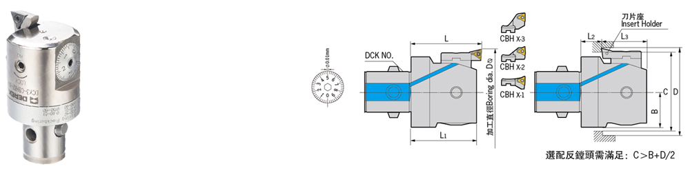 | D | L1 | L | Range | B | L2 | L3 | Range | Insert holder | Insert | Screw | Wrench |
